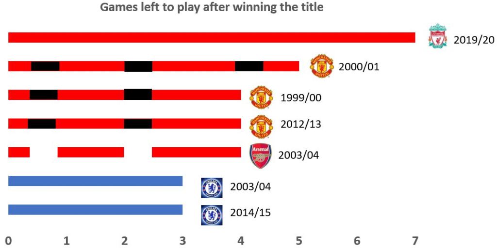 United remain the experts of the early season wrap up though, as they have won the title with five games to spare once, and four games to spare twice. The Arsenal Invincibles also managed to win the title with four games to spare while Chelsea have twice won with three games left.
